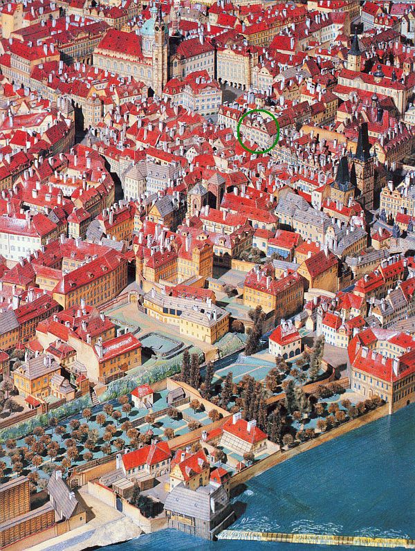 ![]() Tady v samém srdci staré Prahy stojí jeho rodný dům, zde na Langweilově věhlasném modelu města... Repro K. Bečková, Svědectví Langweilova modelu Prahy (1996), s. 5 |