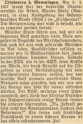 ![]() Krajanský měsíčník tu referuje o jeho projevu v roli bavorského státního ministra práce, kde se dotkl otázky sociálního postavení vyhnanců, nebezpečí bolševismu i poválečných hranic Německa, "s nimiž se nelze natrvalo spokojit" a spojil s tím otázku míru a bezpečnosti Evropy Repro Hoam!, 1957, č. 5, s. 12 |