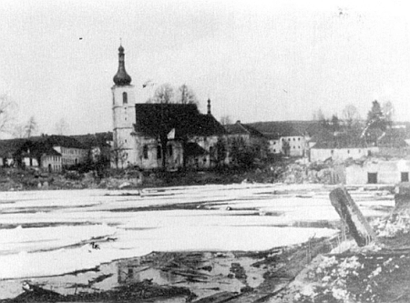 ![]() Ke kostelu už dosahuje voda Reprofoto z informační tabule v Dolní Vltavici Pavel Polák |