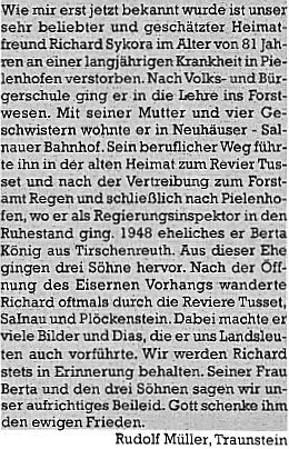 Ani se nelze divit, že na "Medvědí stezce" spíše než bizarní tvary skal (vybírám z turistické mapy jen namátkou: Obří kostky, Pýchavka, Hlava telete, Gotický portál, Soutěska lapků, Perníková skála, Dračí tlama) zajímaly návštěvníka z rodiny vyhnanců stopy lidí v krajině, kde jich kdysi tolik žilo. Psal se rok 1985 a kniha, jejíž se stal text součástí, vyšla rok nato. Richard Sykora, jak je na jiném místě Kohoutího kříže zmíněno, přetlumočil v roce 1987 do němčiny pro krajanský časopis "Glaube und Heimat" (č. 4/1987) text Antonína Nikendeye staršího ze schwarzenberského českého časopisu "Tradice" o stavbě Stifterova památníku nad Plešným jezerem podle vyprávění Franze Saumera, který se tak zařadil mezi samostatně zastoupené autory těchto textových stránek. On sám se podle adresáře části Nové Chalupy v krajanské kronice Nové Pece, z níž je přeložena naše textová ukázka, narodil dne 21. září roku 1920 v Arnoštově (Ernstbrunn), ale Josefina Wölflingová (*26. května 1898 v Arnoštově), která si měla vzít Richarda Sykoru "staršího" (*4. února 1894 v Michlově Huti /Helmbach/) 31. října 1921 v Knížecích Pláních (podle křestních záznamů jich obou), je na archu sčítání lidu z února 1921 uvedena na arnoštovském stavení čp. 9 jako dcera už tou dobou ovdovělé Anny Wölflingové (*28. března 1865 v Arnoštově) s nemanželským dítětem, které je tu uvedeno jako Richard Wölfling. Matriky, jež by to mohly prozradit leccos dalšího, jsou želbohu digitálně nedostupné. Ze zmíněného už adresáře se jen dočítáme, že Richard Sykora "starší" zemřel už v roce 1934 zřejmě v Nových Chalupách, jeho žena Josefina, která ho přežila o čtvrt století, až roku 1959 v bavorském městě Berching v zemském okrese Neeustadt in der Oberpfalz. Richard Sykora "mladší" se zřejmě už po vyhnání v Německu oženil s Bertou, roz. Königovou (*27. října 1920 v Rosallu /ves 1971 zrušena, dnes místní část hornofalckého města Tirschenreuth/) a žili se svými dětmi a vnuky v obci Pielenhofen na západ od Řezna, ale na východ od zmíněného města Berching. Richard Sykora zemřel po dlouhé nemoci pravděpodobně koncem roku 2001 v Pielenhofen, zpráva o jeho skonu vyšla v krajanském časopisu v lednu 2002 bez udání data. Manželka Berta tam v Pielenhofen zemřela 2. března roku 2014. Příjmení Sýkora mu kdysi dal člověk, který je na vimperském křestním záznamu pro Michlovu Huť psán ještě s tou čárkou nad tvrdým "y" a jehož otec František Sýkora byl (jako později zřejmě v Nových Chalupách on) ve dnes tak odlehlé Michlově Huti schwarzenberským "lučním hajným" ("Wiesenheger" čteme v matrice). Až sem jsme ne zrovna malou odbočkou došli po Medvědí stezce.
