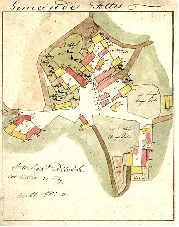 ![]() Plánek vsi Záluží (Allusch) podle stavu roku 1946 s lípou při návsi, starou 600 let, tedy z časů, kdy byla ves v roce 1389 učiněna poplatnou krumlovské kapli sv. Jeronýma (dříve sv. Václava) Repro Glaube und Heimat, 2009, č. 8. s. 65 |
