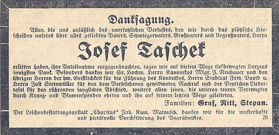 ![]() Poděkování za projevy soustrasti (viz i Margarethe Hampelová) Repro Budweiser Zeitung, 1939, č. 10, s. 12 |