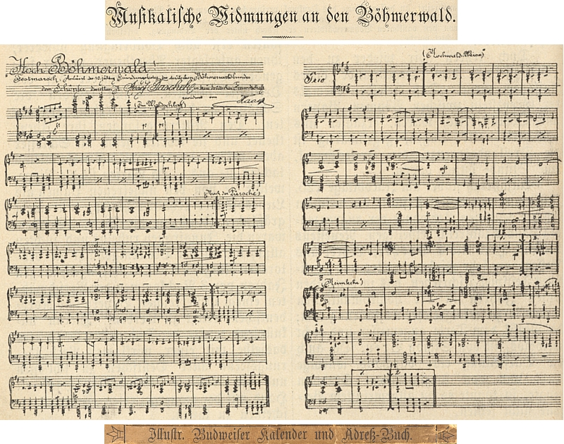 ![]() Slavnostní pochod "Hoch Böhmerwald", věnovaný Josefu Taschekovi u příležitosti 10. výroční založení DBB v notovém záznamu na stránkách "Ilustrovaného Budějovického kalendáře a adresáře na rok 1895" Repro Illustr. Budweiser Kalender und Adreß-Buch 1895, s. 80 |