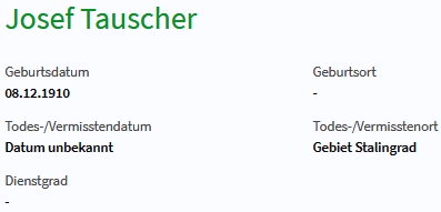 ![]() Pravděpodobný záznam otcův v databázi padlých německých vojáků Repro databáze Volksbund Gräbersuche-Online |