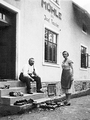 ![]() Před mlýnem sedí jeho dědeček Johann Weishäupl, mlynář, vedle něj opět mladá učitelka z mateřské školy, která u nich ve mlýně bydlela Repro archív rodiny Tauscherovy |