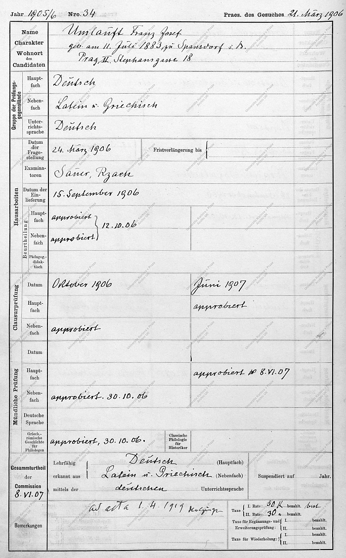 Protokol univerzitní zkušební komise pro učitelství na středních školáchh Repro Archiv Univerzity Karlovy, fond Zkušební komise pro učitelství na středních školách Německé univerzity v Praze, Knihy zkušebních protokolů, inv. č. 2, Kniha zkušebních protokolů sv. II (1905-1910), strana 34 (projekt "Studenti pražských univerzit 1882-1945") |