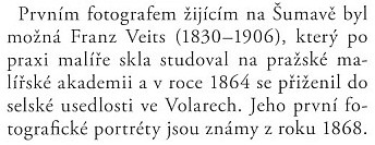 ![]() Podle Pavla Scheuflera byl Veits asi i prvým fotografem žijícím na Šumavě... Repro M. Anděra a P. Zavřel za kol., Šumava : příroda, historie, život (2003), s. 484 |