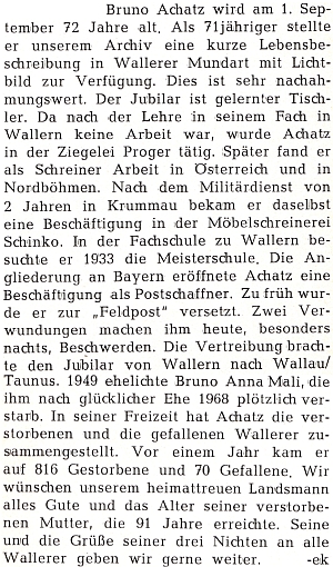 Bruno Achatz a připomínka jeho 72. narozenin Repro Böhmerwäldler Heimatbrief, 1974, č. 8, s. 282-283 |