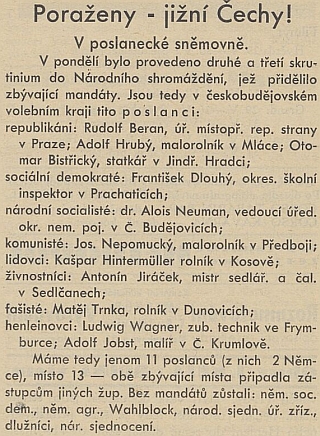 ![]() Ve volbách roku 1935 byl spolu s ním v jižních Čechách zvolen do parlamentu za SdP Adolf Jobst Repro Jihočeské listy, 1935, č. 42, s. 1 |
