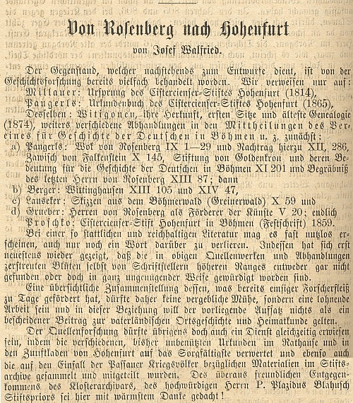 Úvod jeho "cestopisu" z Rožmberka do Vyššího Brodu Repro Inhaltsverzeichnis über "Mitteilungen des Vereines für Geschichte der Deutschen in Böhmen", 1880, č. 18, s. 274-275 |