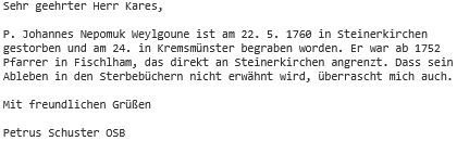 ![]() Záznamy o jeho skonu v matrikách v Steinerkirchen i Kremsmünsteru chybí, jasno udělala až tato odpověď na dotaz tamnímu klášterním archívu Repro archív Kohoutího kříže |