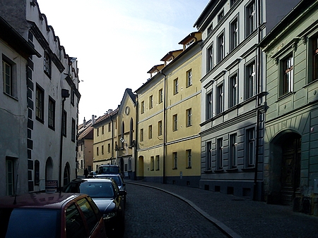 Rodný dům čp. 161 (bílý renesanční na snímku vlevo) v prachatické Neumannově ulici (dříve nesla i tato část jméno Horní) stojí takřka naproti rodnému domu Johanna Nepomuka Neumanna Foto Ivo Kareš |