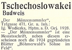 ![]() Inzerát na jím vydávaný numismatický měsíčník "Der Münzensammler" (1928-1936) Repro Böhmerwald's Söhne im Felde, 1928, č. 16, 3. s. obálky |