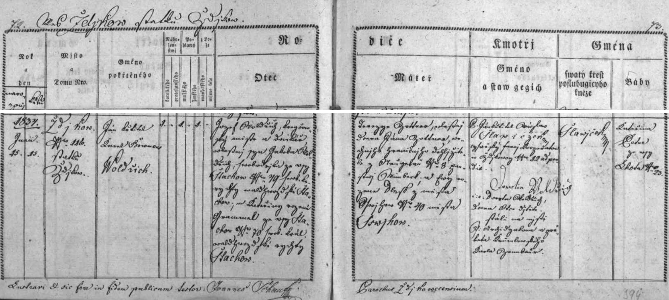Záznam o jeho narození ve zdíkovecké křestní matrice Repro SOA v Třeboni - digitální archív |