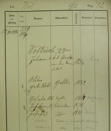 ![]() Jeho pražská policejní přihláška, na níž je uedena i jeho choť Ottilie, roz. Hablová (1842-1897), Repro Národní archiv, Policejní ředitelství I, konskripce, karton 709, obraz 102 |