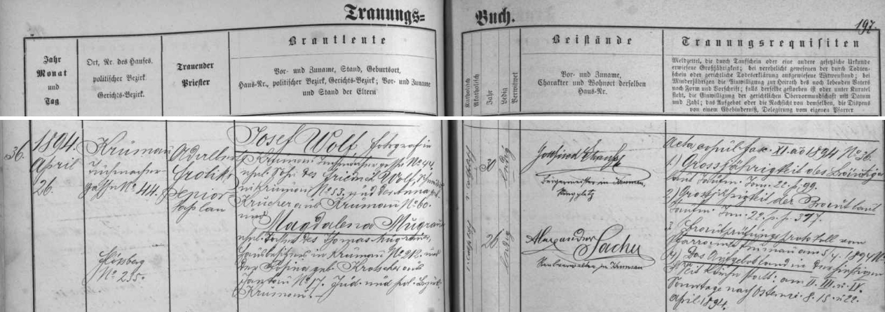 Záznam českokrumlovské oddací matriky o jeho svatbě roku 1894 Repro SOA v Třeboni - digitální archív |