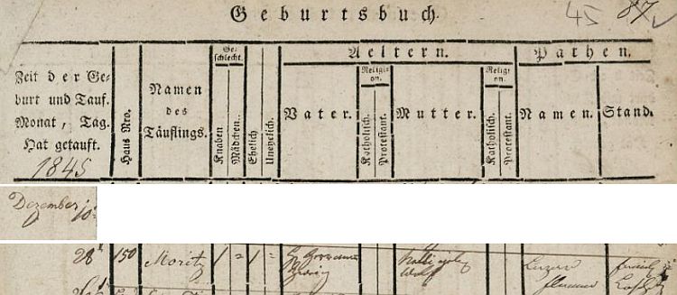 ![]() Záznam prostějovské židovské matriky o zdejším narození otcově 28. prosince roku 1845 v domě čp. 150 Repro Národní archiv, fond Matriky židovských náboženských obcí v českých krajích (Archivní VadeMeCum) |